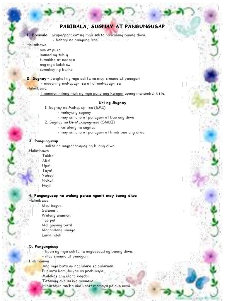Parirala sugnay at pangungusap halimbawa. Ito ay tinatawag ding punong sugnay. Ang sugnay na di makapag iisa o di malayang sugnay ay maaaring may simuno o panaguri ngunit hindi nagtataglay ng kumpletong diwa.