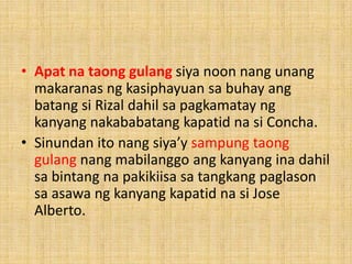 Bilang tagapagmana mayroon kayong. Siya ang binansagang Concha ng kanyang mga kapatid at kaanak si Concepcion Rizal ay ipinanganak noong 1862 at namatay sa edad lamang na tatlong taon noong 1865. Si Teodora Aquino noong ika-16 ng Agosoto 1911 sa Calle San Fernando Binondo Maynila dahil sa kaniyang kahinaan.
